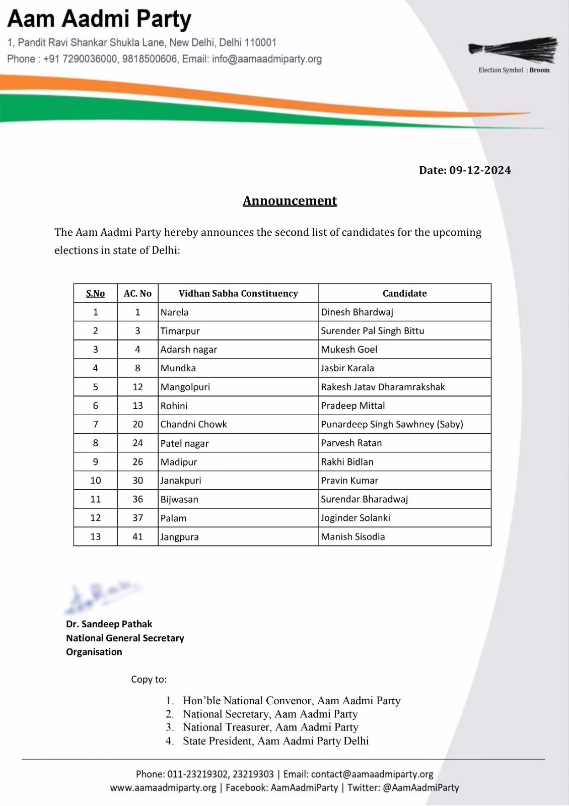 Among others, AAP has fielded Dinesh Bhardwaj from Narela, Surendra Pal Singh Bittu from Timarpur, Mukesh Goyal from Adarsh Nagar, Jasbir Karla from Mundka, Rakesh Jatav Dharmarakshak from Mangolpuri, Pradeep Mittal from Rohini, Punardeep Singh Sahni (SEBI) from Chandni Chowk, Pravesh Ratan from Patel Nagar, Rakhi Bidla from Madipur, Praveen Kumar from Janakpuri, Surendra Bhardwaj from Bijwasan, Joginder Solanki from Palam, and Manish Sisodia from Jungpura.