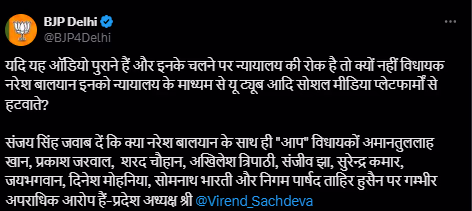 Delhi BJP President Virendra Sachdeva questioned why Naresh Balyan didn’t seek a court order to remove old audio recordings from platforms like YouTube if they were court-banned. Sachdeva demanded a response from Sanjay Singh regarding other AAP legislators, including Amanatullah Khan, Prakash Jarwal, Sharad Chauhan, and more, facing serious criminal charges.