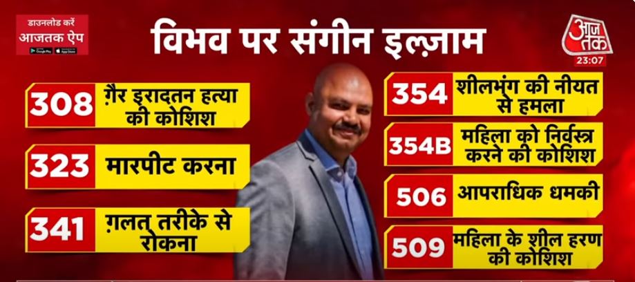 Swati, after managing to free herself from Vibhav's clutches, picked up her fallen glasses and sat on the sofa, calling the Delhi Police on 112 from there to report the incident. But Vibhav threatened to kill her. As soon as he noticed that Swati had made a call to the police, he left the room. Swati went to the police station but eventually left without filing a complaint. She gave her statement to Delhi Police three days later, which resulted in FIR against Vibhav. The police have charged Vibhav Kumar with various sections, including IPC Section 308 for attempt to commit culpable homicide, Section 323 for causing hurt, Section 341 for wrongful restraint, and others related to assault and criminal intimidation. Supreme Court lawyer Anurag Kishore said that these charges are serious and can result in severe punishment upon conviction.