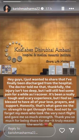 On Instagram, Karishma shared a photo from the hospital, updating fans about her health. She expressed, 'I am relieved to inform you that I've finally been discharged. According to the doctors, it's fortunate the injuries weren't deeper, but I will experience pain for some time as I heal.'