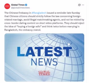 Chinese nationals are urged by the embassy to strictly adhere to the relevant laws when marrying a foreign person. They have been cautioned to stay vigilant against illegal matchmaking agents for marrying Bangladeshi men or women and not to be misguided by cross-border dating content on video platforms.