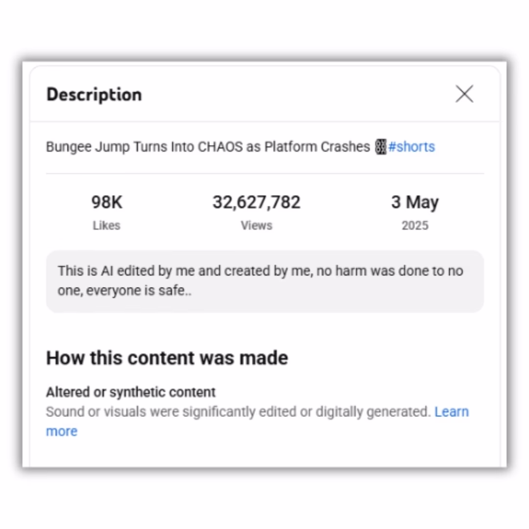 Upon reverse-searching keyframes of the video, we found it was posted by a YouTube channel named 'Quake Skyfall' on May 3, 2025, stating, "This video was edited using AI. No harm was done in its making; everyone is safe."