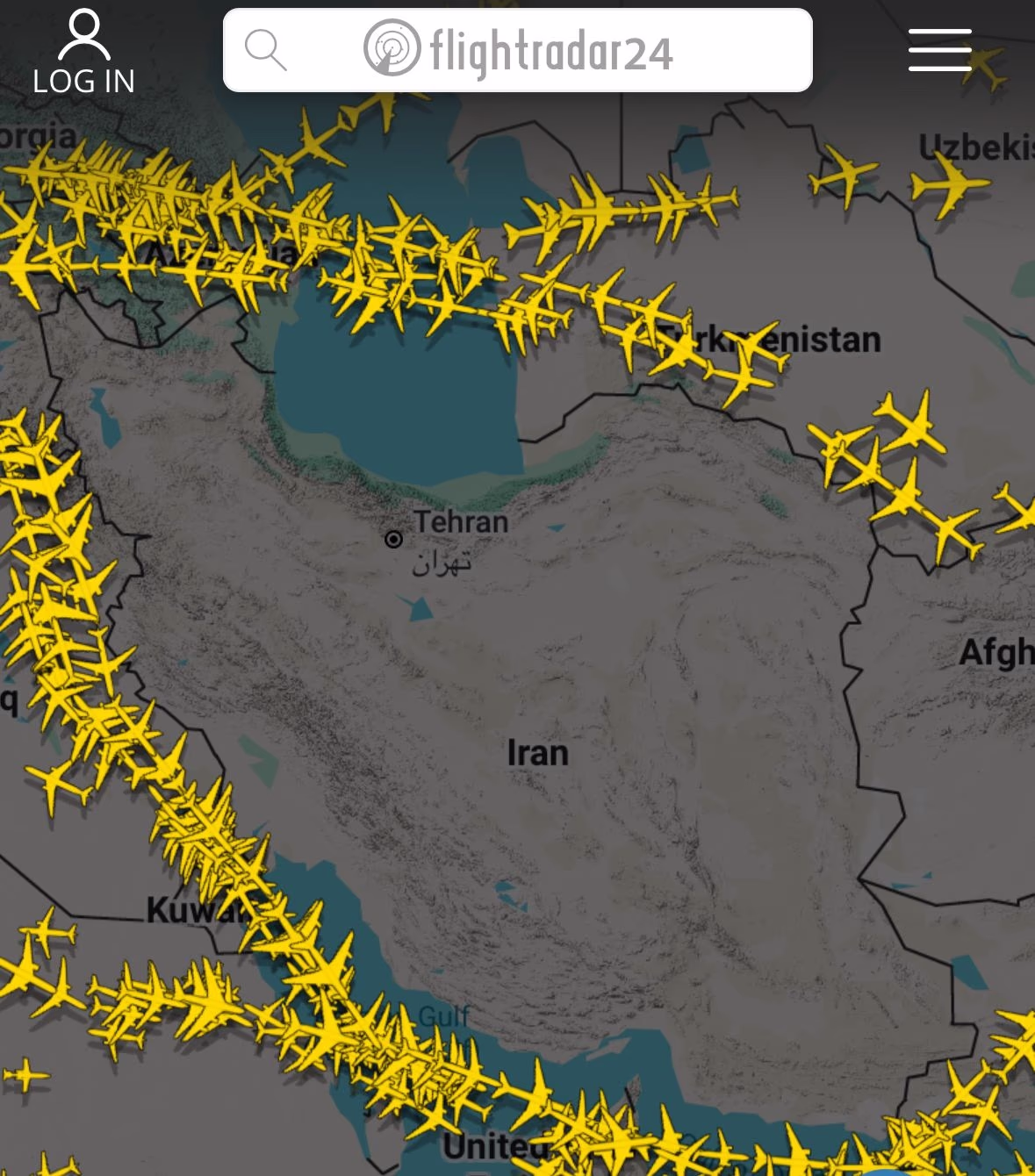 According to FlightRadar24's website, no flights are passing over Iran, with all opting for alternative routes.