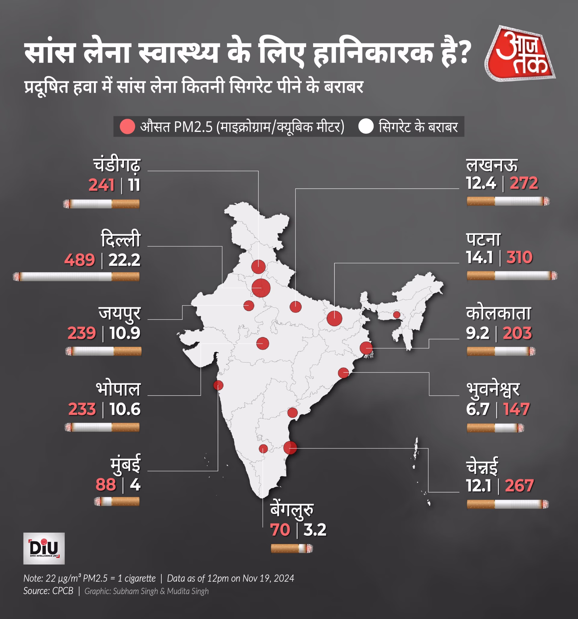 This means if you are breathing while in Delhi, the damage to your lungs is equivalent to smoking 23 cigarettes a day. The average AQI in the capital is 489. Apart from Delhi, other cities also present worrying statistics, such as Chandigarh, where the AQI of 241 equals smoking 11 cigarettes daily.