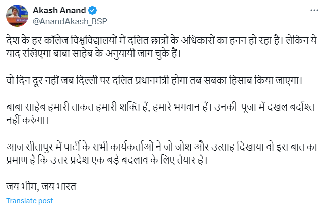 In Sitapur, Akash Anand remarked that a government that starves the youth and enslaves the elderly is a terrorist's government, akin to that of the Taliban in Afghanistan. He stressed that the rights of Dalit students in universities across the country are being infringed upon but reminded the crowd that the followers of B.R. Ambedkar have awakened. He envisioned a future where a Dalit Prime Minister would hold office in Delhi, ensuring accountability for all. Declaring Ambedkar as their strength and deity, Anand warned against any interference in their revered practices. The enthusiasm and energy shown by the party workers in Sitapur, according to Anand, is evident that Uttar Pradesh is ready for significant change.
