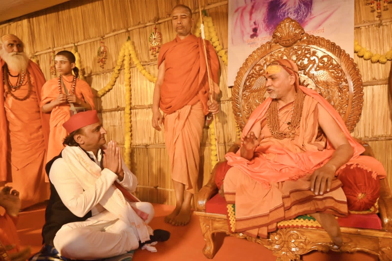 A particular photo of Akhilesh seated humbly on the ground, hands joined in respect, talking gleefully with Shankaracharya Swami Avimukteshwaranand at his ashram has been much discussed. This photograph captured the essence of reverence, with Shankaracharya appearing overjoyed as he offered sweet laddoos as prasad to Akhilesh.
