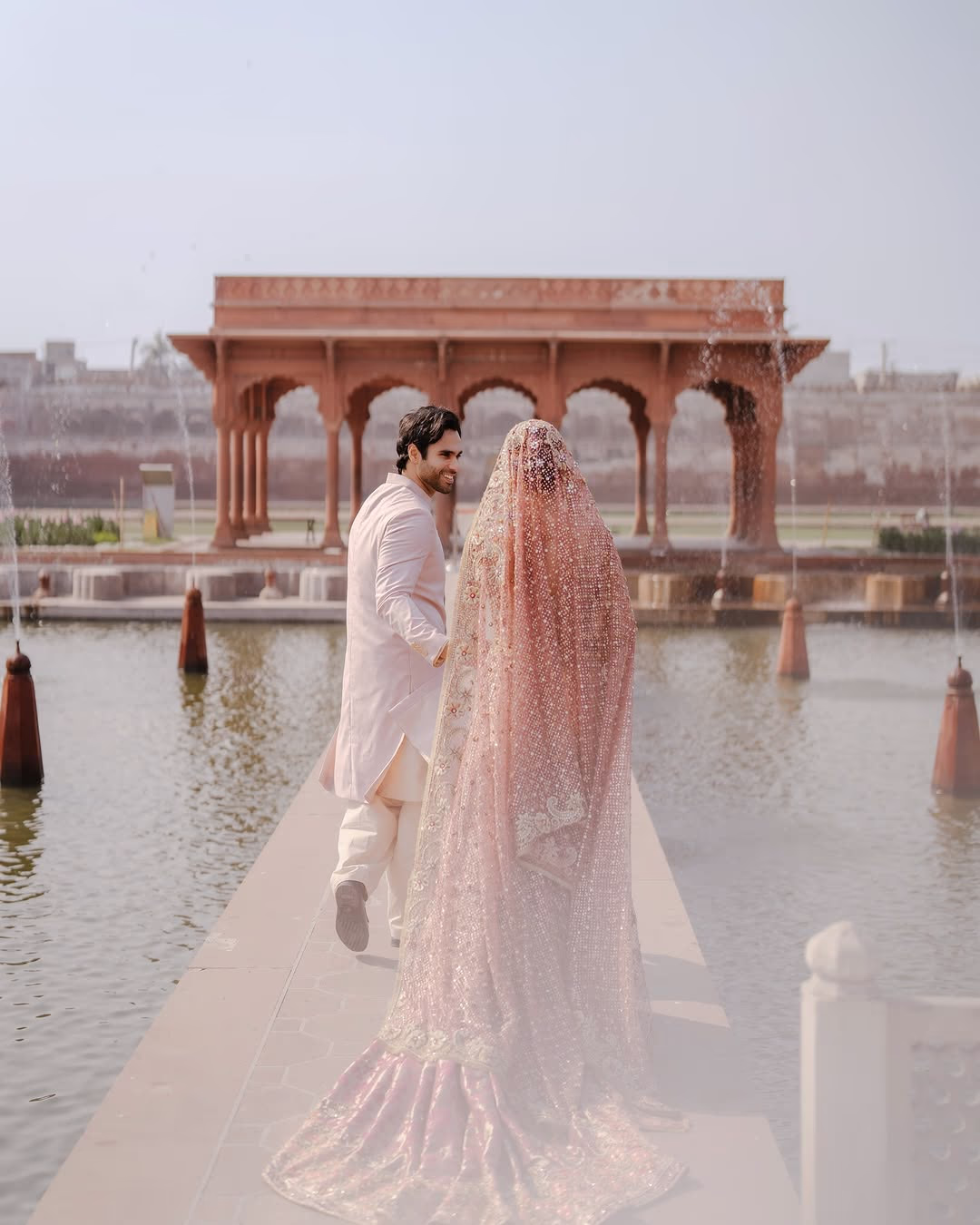 Mawra and Ameer's photoshoot is remarkably romantic. Numerous heartfelt moments are captured between them. One picture shows the couple walking hand in hand through a path adorned with fountains.