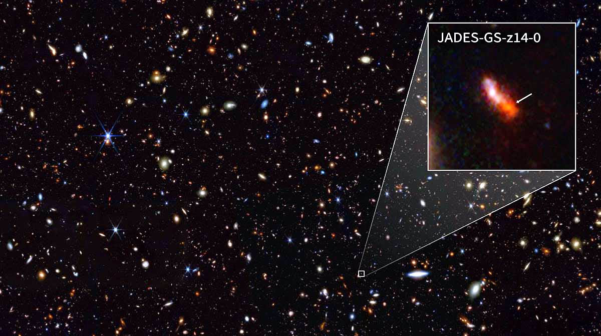 The existence of JADES-GS-z14-0 challenges our cosmic models, as galaxies are expected to take considerable time to develop. It is so distant that it requires immense and radiant light to be observable, located 13.4 billion light-years away.