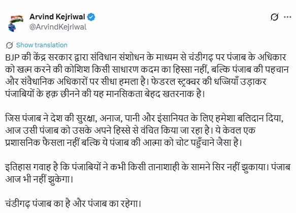 Arvind Kejriwal remarked, "The BJP government's attempt to eradicate Punjab’s rights over Chandigarh through constitutional amendment is not a mere step but a direct attack on Punjab’s identity and constitutional rights. Disregarding the federal structure to snatch away rights is a dangerous mindset."