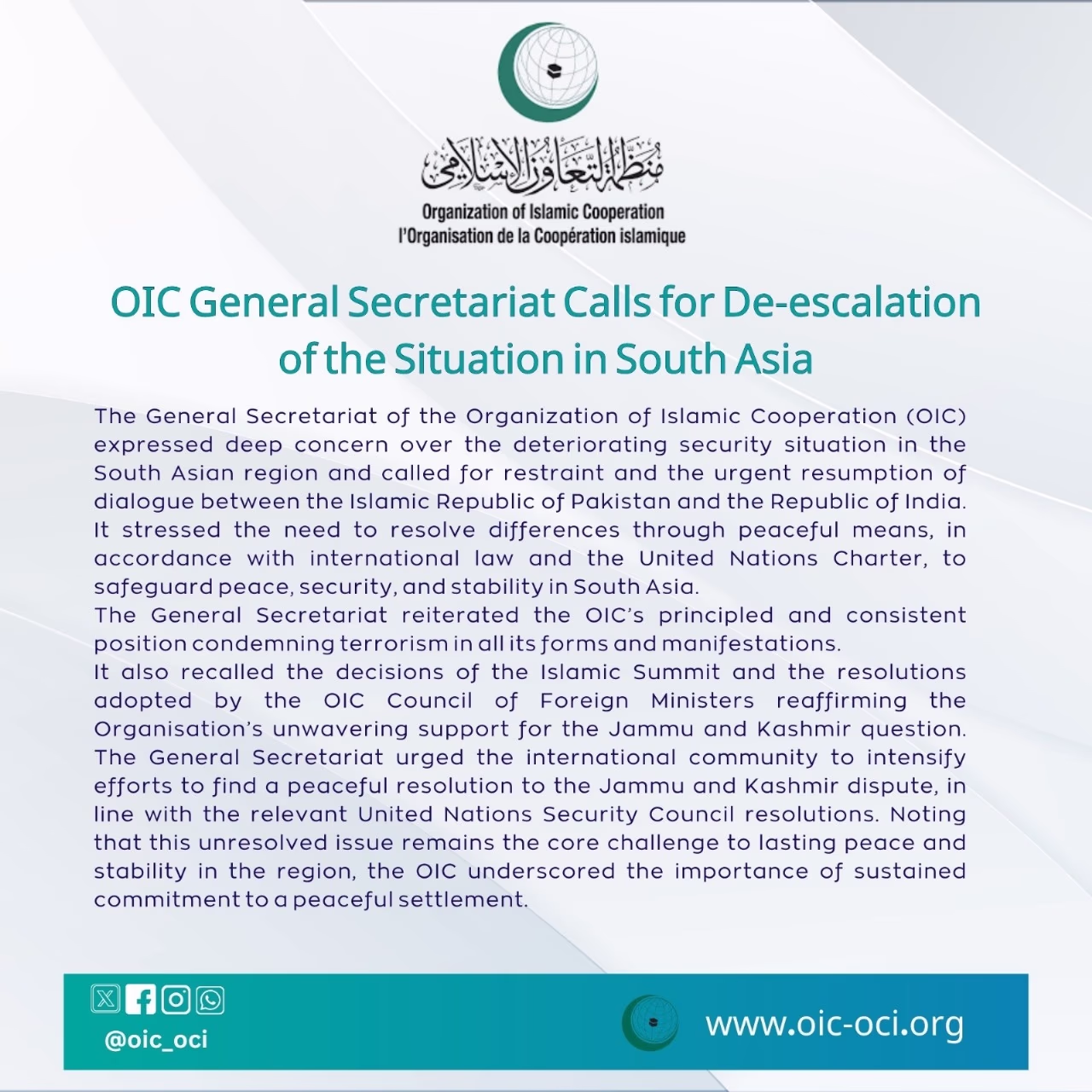 The Organization of Islamic Cooperation (OIC) has issued a statement over the escalating tension between India and Pakistan. Expressing profound concern about the deteriorating security landscape in South Asia, the OIC Secretariat has urged for the immediate resumption of dialogue between India and Pakistan. The organization emphasized the need for resolving all differences peacefully, adhering to international law and the United Nations Charter, to maintain regional peace, security, and stability.