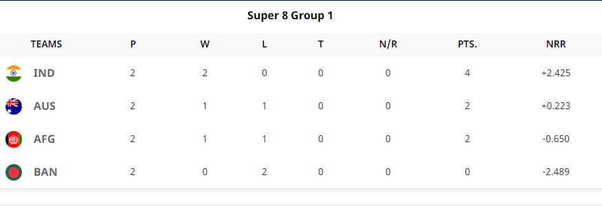 Note that the T20 World Cup 2024 Super-8 has been divided into two groups with four teams each. From these, the top two teams in each will proceed to the semifinals. Group-1 features India, Bangladesh, Australia, and Afghanistan, while Group-2 comprises West Indies, the USA, South Africa, and the defending champions England.