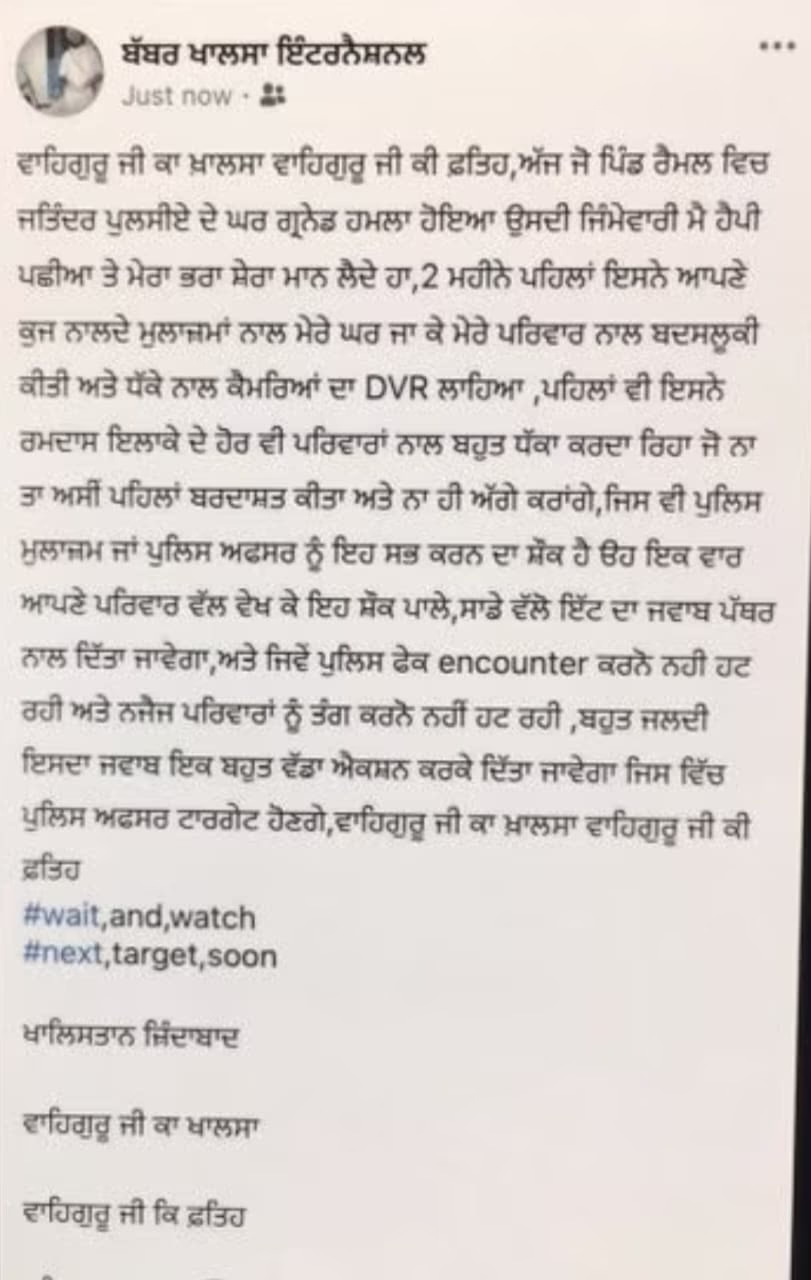 Admitting responsibility for the attack in their social media post, the organization declared, 'On Monday, the grenade attack at Jatinder the policeman's home in Raimal village is claimed by us—Happy Passia and Bhai Shera. Two months ago, he, along with some policemen, misbehaved with my family and forcibly removed our DVR. Previously, he had wronged other families in the Ramdas area, actions we have tolerated neither then nor now.