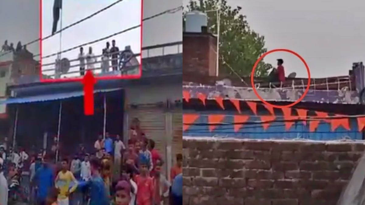 Two new videos of the violence in Bahraich, Uttar Pradesh have surfaced on social media. One video reportedly shows the victim, Ramgopal Mishra, on a rooftop. While taking down a green flag, gunfire can be heard, causing Ramgopal to fall. From another rooftop, an individual capturing the video can be heard shouting, 'Look, he's been shot.'