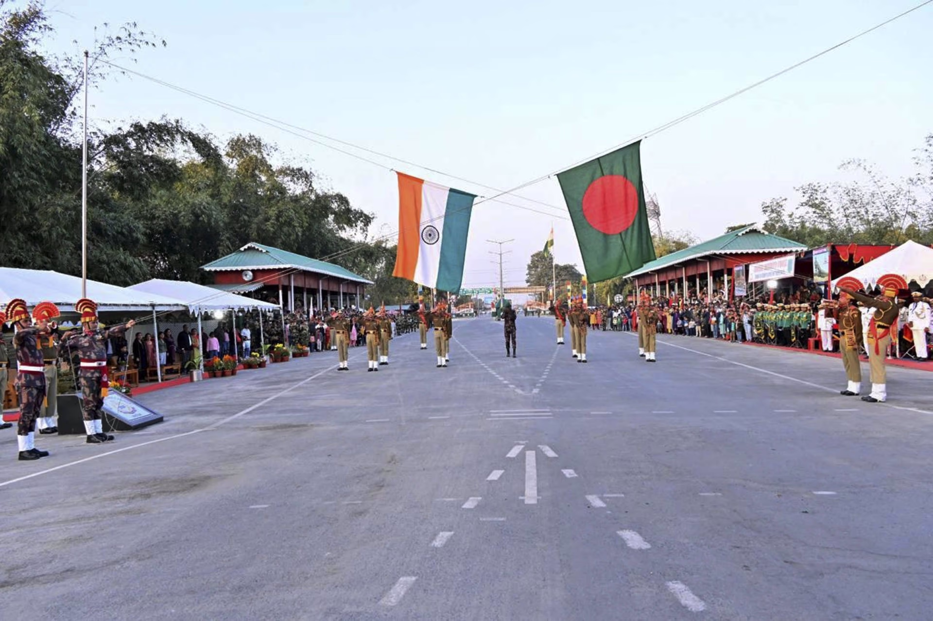 The 4096.7-kilometer-long border with Bangladesh crosses five Indian states: West Bengal (2216.70KM), Assam (263 KM), Meghalaya (443 KM), Tripura (856 KM), and Mizoram (318 KM).