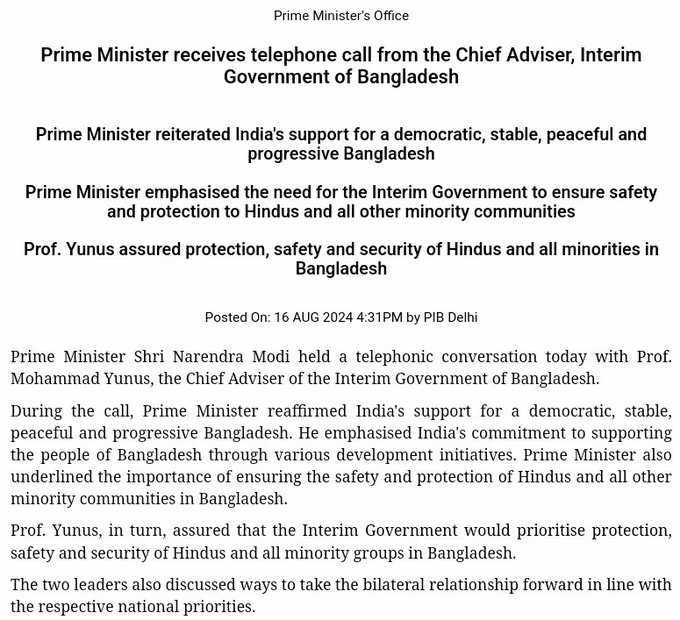 Prime Minister Narendra Modi posted on X, "Spoke with Professor Muhammad Yunus over the phone. The chief advisor to the interim Government of Bangladesh discussed the current situation. Reaffirmed India's support for a democratic, stable, peaceful, and progressive Bangladesh. He assured the safety, security, and protection of Hindus and all minorities in Bangladesh."
