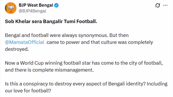 The visit of Argentina's football superstar Lionel Messi to Kolkata has sparked a political storm in West Bengal. Following disorder and vandalism at the Vivekananda Yuba Bharati Krirangan in Salt Lake, Chief Minister Mamata Banerjee issued an apology, expressing her deep distress and shock over the incident. In harsh contrast, the Bharatiya Janata Party (BJP) labeled it an insult to both Bengal and football, directly targeting the Trinamool Congress (TMC) government.