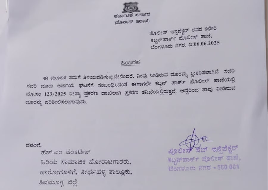 Following the receipt of the complaint, the police department issued a clarification note. The police confirmed that a case registered under No.123/2025 is already ongoing at Cubbon Park police station, and the investigation is in progress.