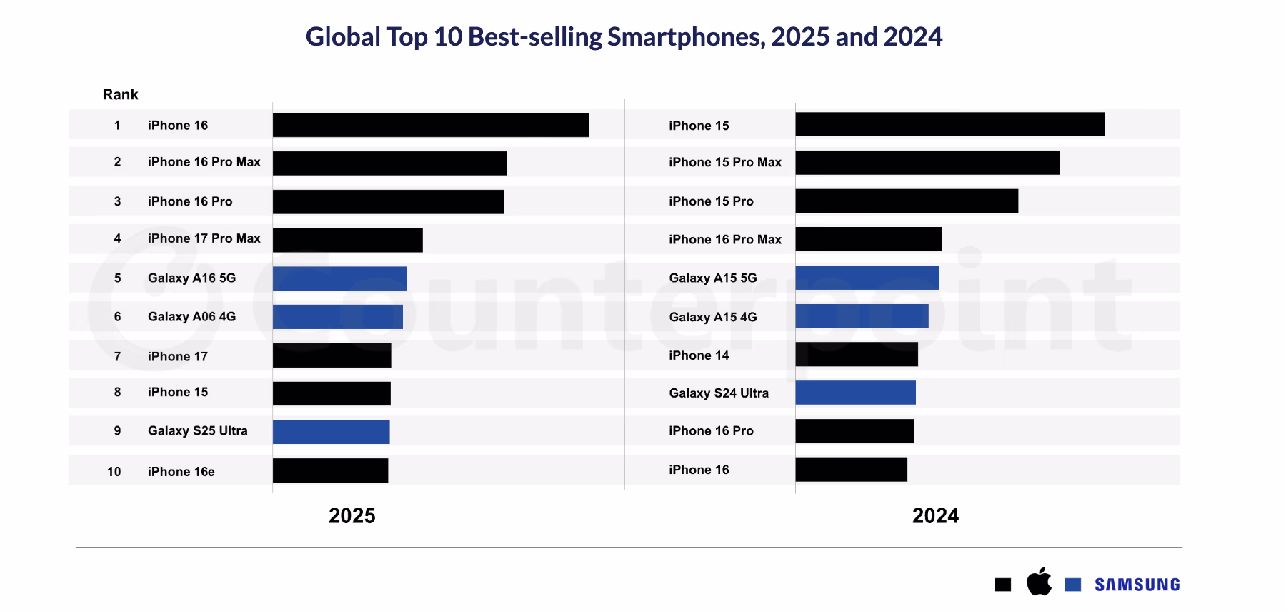 Fast forward to the third quarter of 2025, Xiaomi disappears from the list of best-sellers. Apple and Samsung split the lineup evenly, each showcasing five top devices.