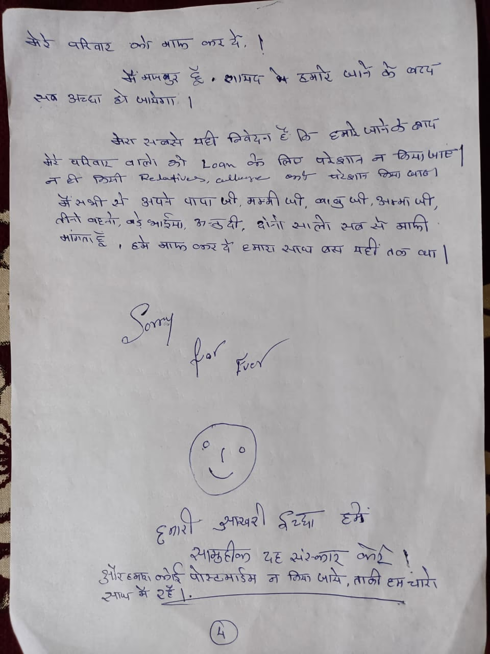 The plea is that after we leave, our family members should not be troubled for these loans. Nor should any relative or coworker be harassed. I apologize to my parents, in-laws, my three sisters, elder brothers, dear family members, and both brothers-in-law. Forgive us. This is where our journey ends. Our last wish is to avoid any post-mortem and allow simultaneous final rites for us all, so we stay together.'