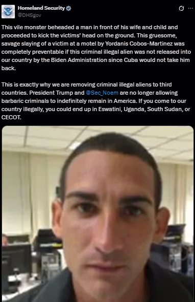 The department stated that Cuba had previously refused to accept Cobos-Martinez, leading to his release under the Biden administration. DHS's statement read, "President Trump and Secretary Noem are no longer allowing barbaric criminals to stay indefinitely in America. If you come to our country illegally, you may be sent to CEOT or elsewhere."