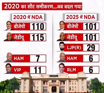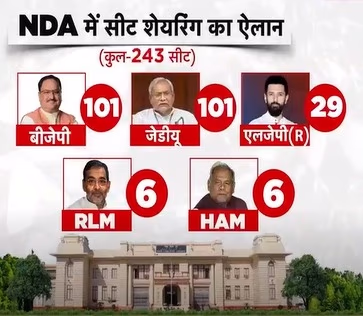 The NDA has declared the seat-sharing arrangement for the Bihar Assembly elections. Union Minister and BJP's Bihar in-charge, Dharmendra Pradhan announced on Sunday that both BJP and JDU will field candidates in 101 constituencies, while Chirag Paswan's LJP(R) will compete in 29 seats. Jeetan Ram Manjhi's Hindustani Awam Morcha (HAM) and Upendra Kushwaha's Rashtriya Lok Morcha (RLM) have each been allotted 6 seats.