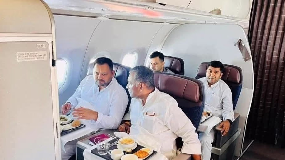 RJD supremo Lalu Prasad Yadav and his son, Tejashwi Yadav, took a flight from Patna to Delhi. Coincidentally, Congress MP Akhilesh Prasad Singh was also on the same flight, seated right next to Tejashwi Yadav.