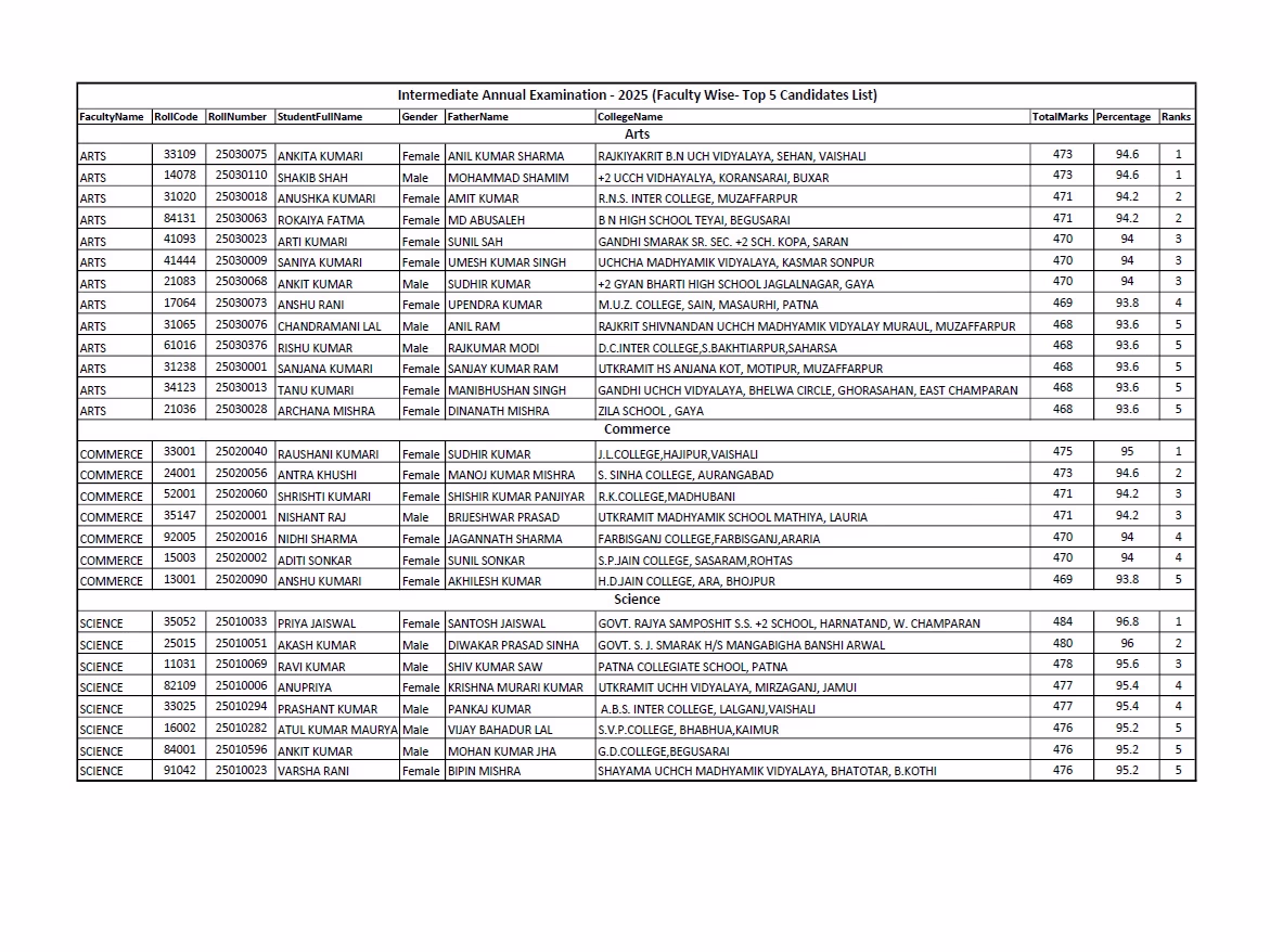 BSEB Bihar Board 12th Result, Stream Wise Toppers List 2025:
