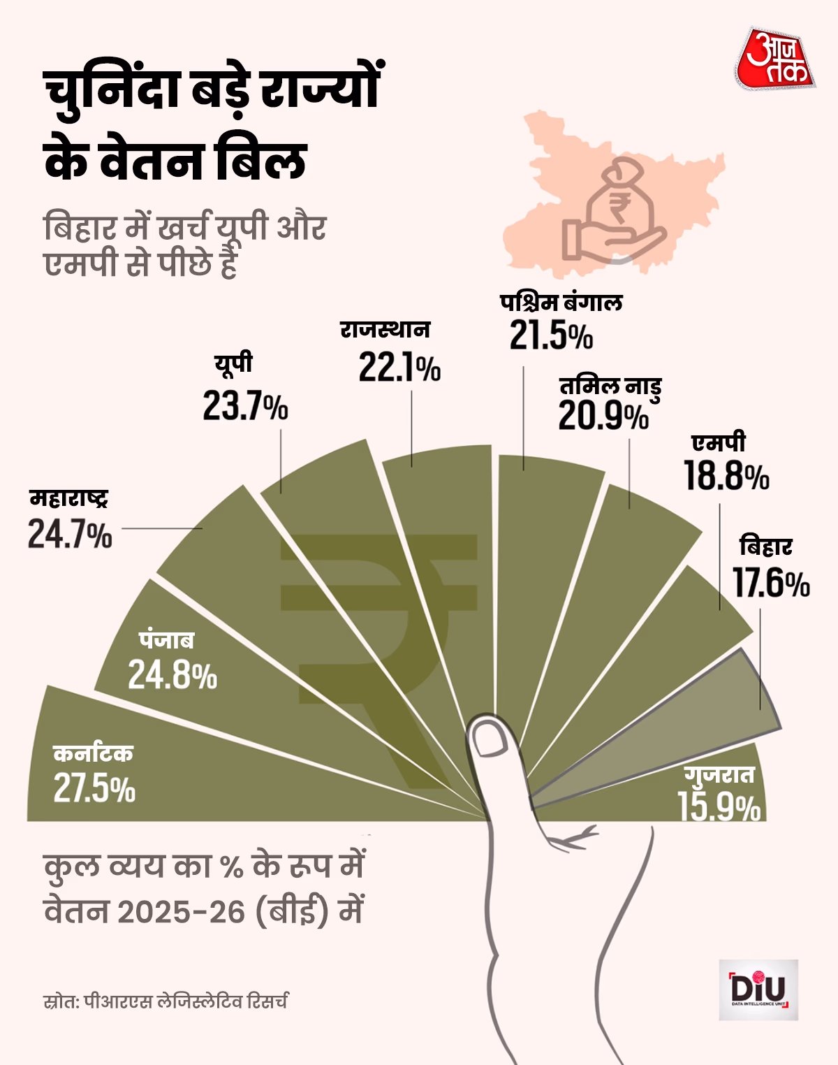 Currently, Bihar spends over 15% of its total budget on employee salaries. According to PRS Legislative Research, this expenditure is increasing every year. The government estimates that this year it will rise to 17%, up from about 12% in 2018-19.