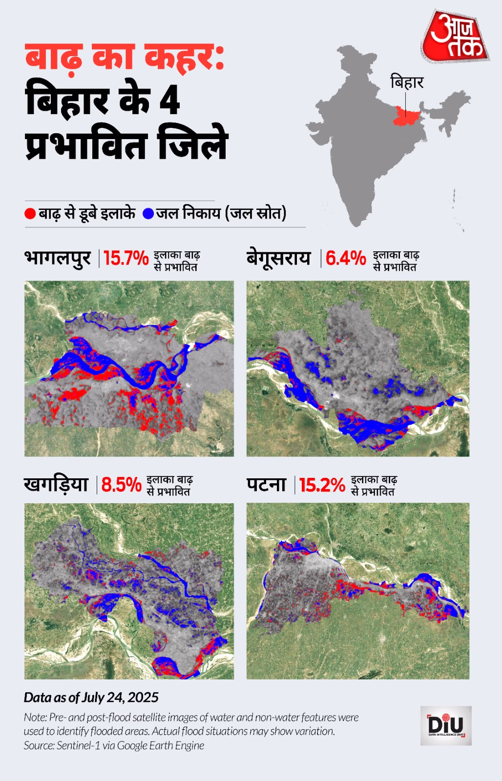 Satellite imagery highlights that approximately 15% of Patna district is engulfed by floods. The impact in Bhagalpur is slightly higher, at 15.7%, with around 6.4% of Begusarai's area submerged and 8.5% of Khagaria under floodwater currently.