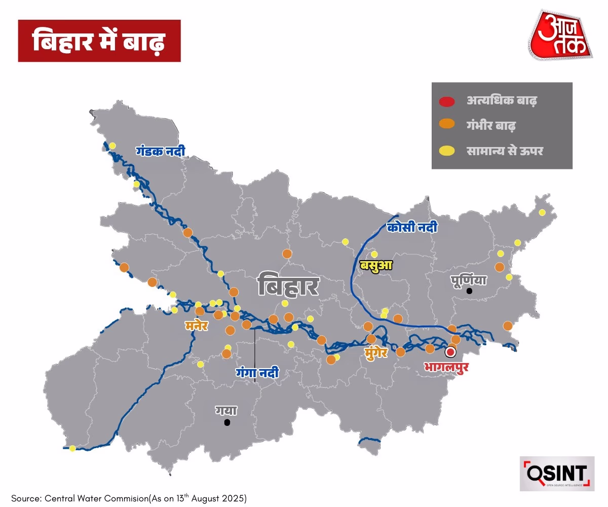 According to Central Water Commission (CWC) data, the Ganga river level at Bhagalpur station has surged to 34.86 meters, matching the high flood level and exceeding the 33.68-meter danger threshold. The conditions at neighboring Kahlgaon and Ekchari stations are equally precarious.