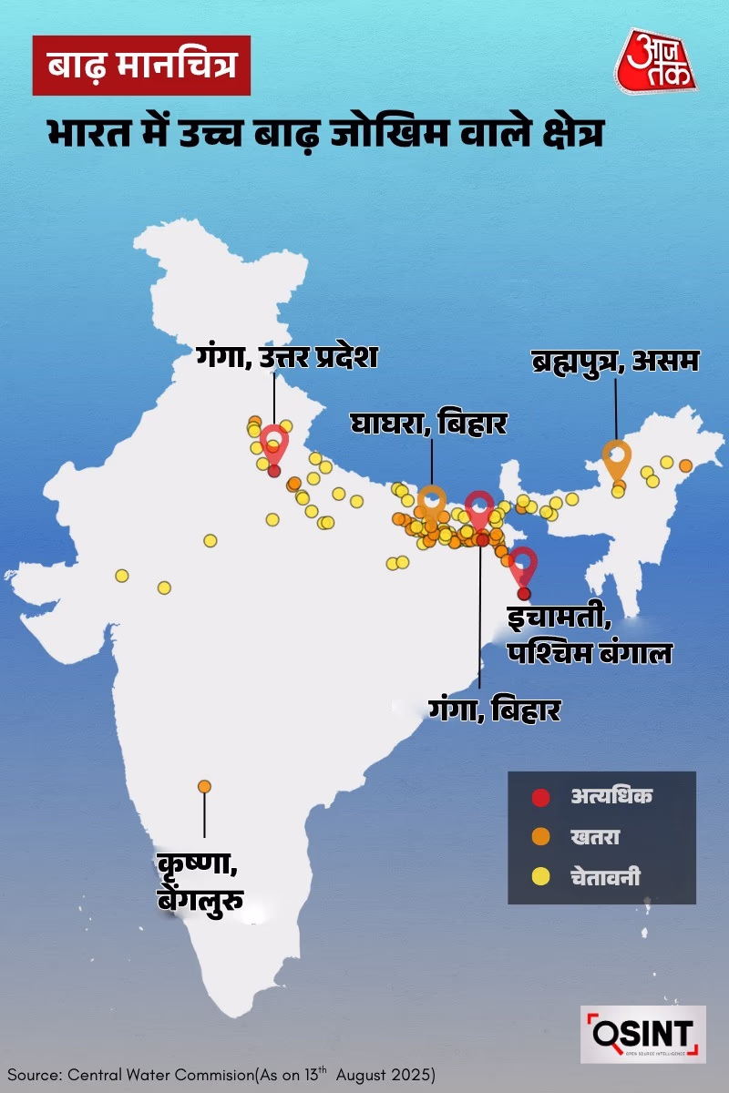 According to CWC statistics, the Teesta in Sikkim and West Bengal, Yamuna in Uttar Pradesh, and Chandan river in Bihar are flowing at elevated levels. The IMD has issued a red alert for Sikkim, Assam, and Meghalaya, and an orange alert for Bihar, Himachal Pradesh, and Arunachal Pradesh.