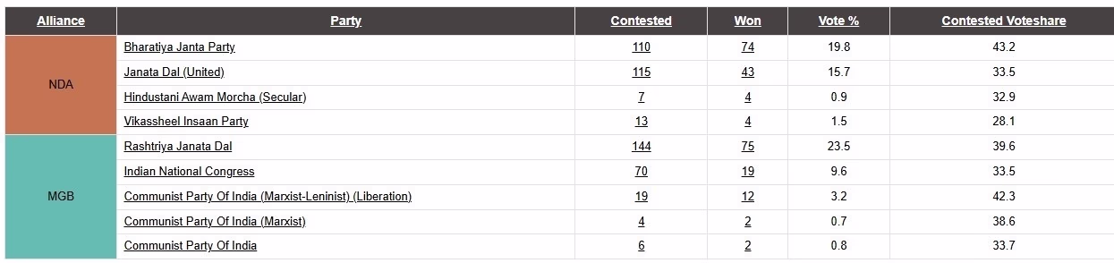 On the other hand, within the Mahagathbandhan, the Rashtriya Janata Dal (RJD) contested 144 seats, winning 75. Indian National Congress (INC) contested 70 seats and won 19. CPI (ML) Liberation contested 19 and won 12, CPI (M) contested four and won two, while the CPI contested six and secured victory on two seats.