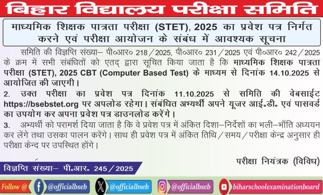 The Bihar School Examination Board has announced the release date for the Bihar STET Admit Card 2025. Hall tickets for the Secondary School Teacher Eligibility Test will be available to candidates on October 11, 2025. Candidates can view the official notice on BSEB's official website, bihar-stet.com. The computer-based examination will be conducted on October 14, 2025. The admit card will be issued on October 11, 2025.