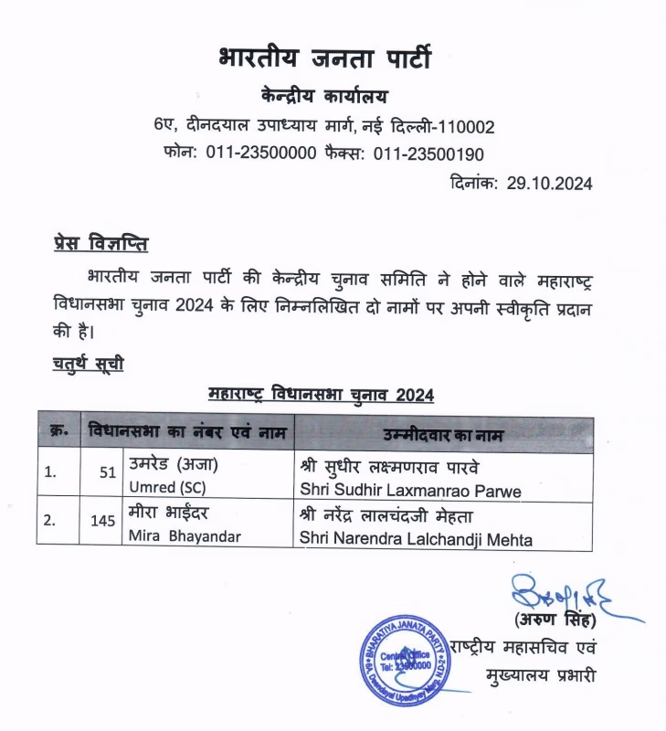 The BJP has unveiled its fourth list for the Maharashtra assembly elections, naming candidates for two constituencies. Narendra Mehta secures the ticket for Meera Bhayander, with Sudhir Parwe running from the Umred seat.