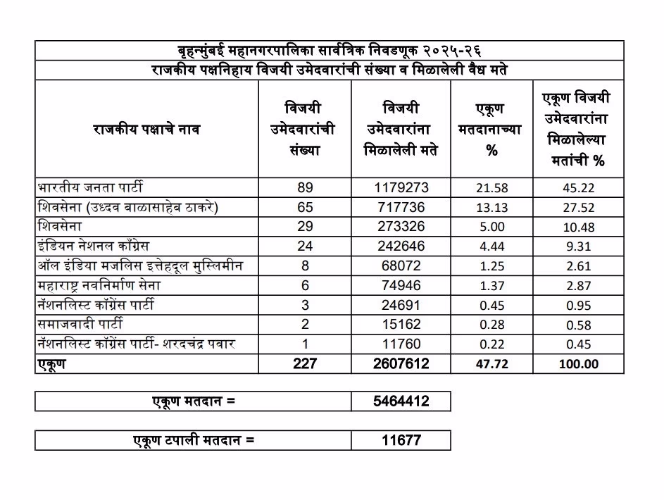 Results for all 227 wards in Mumbai were declared around midnight. BJP won 89 seats, and its ally Shiv Sena secured 29 seats, while the Shiv Sena (UBT) obtained 65 and MNS secured six seats. Congress, in alliance with Vanchit Bahujan Aghadi, won 24 seats, AIMIM grabbed 8, NCP claimed 3, and the Samajwadi Party managed 2, while NCP (SP) received just one seat.