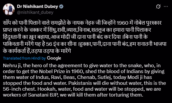 Nishikant Dubey took to X to post, highlighting how Nehru, the architect of an agreement that 'fed water to a snake,' had sacrificed Indian blood for the Nobel Prize by giving away the waters of Sindhu, Ravi, Beas, Chenab, and Sutlej. Today, Modi has cut off their access to both food and water; Pakistanis will perish without water. This is what 56 inches of chest entails—an absolute cessation.
