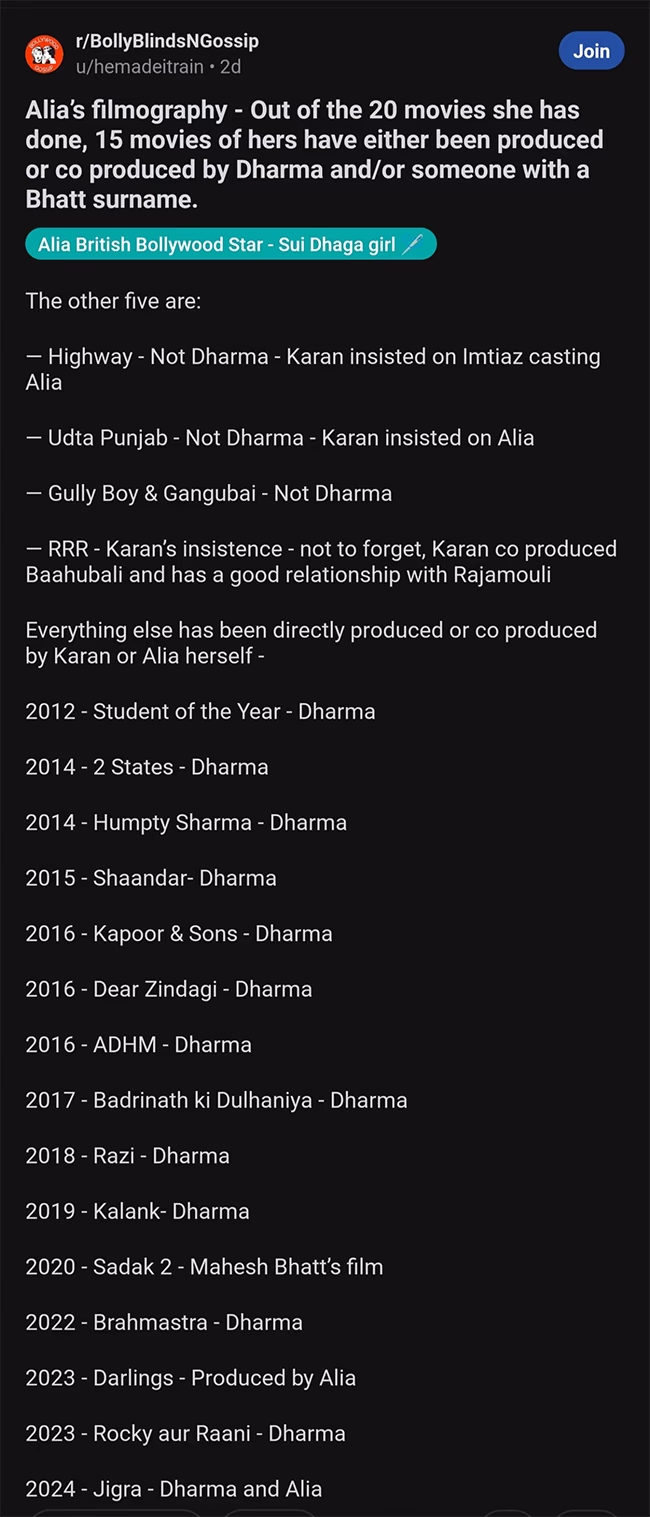 On Reddit, a user compiled a list of films where Alia's casting was reportedly influenced by Karan Johar. Observations in the list noted that in nearly all of the 20 films Alia has done, either Karan Johar or a member of the Bhatt family (including Alia, her sister, or her father) was involved as producer or co-producer.