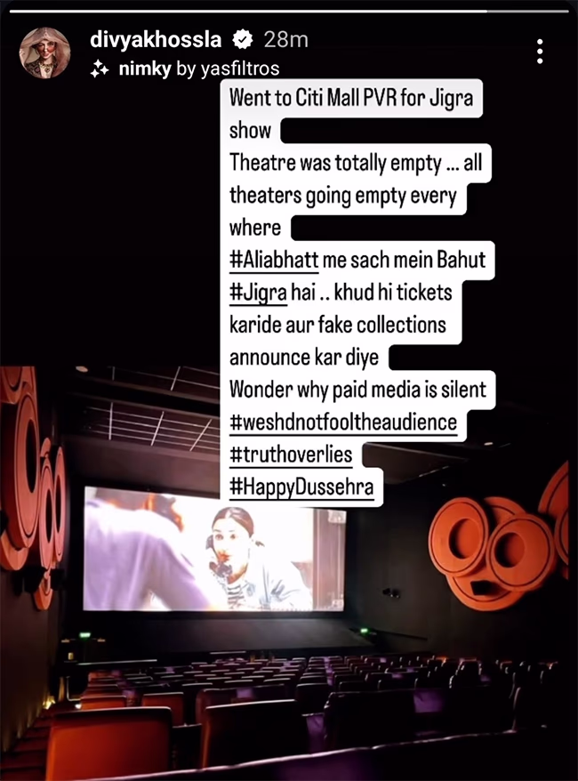 The situation worsened when Divya indirectly accused Karan Johar of stealing films through a post on her social media handle, sharing a photo of an empty theater supposedly running 'Jigra.' She captioned it accusing Alia of purchasing tickets herself to inflate box office collections.