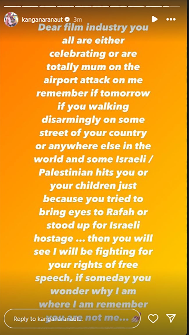 In her post, Kangana wrote: 'Dear film industry, you are either celebrating the attack on me at the airport or are choosing to remain completely silent. But remember, if someday you or your children are walking on the streets of your country or elsewhere in the world, and Israelis/Palestinians attack you... just because you all stood for Rafa, supported the Israeli hostage... then you will see me fighting for your freedom of speech... If one day you wonder why, and where I am, remember you are not me...'