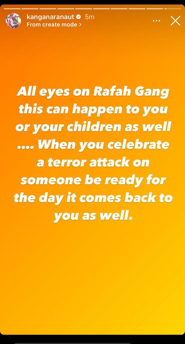 The actress further stated in another post, 'All Eyes on Rafa' gang, this could also happen to you and your children. When you celebrate a terrorist attack. Be prepared for the day it happens to you.