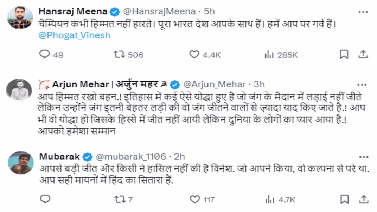 Another user commented, 'India is proud of you, Vinesh. Please stay strong, and best wishes to you.' Another wrote, 'Champions never give up. The entire nation is with you, and we are proud of you.' A supporter said, 'Stay strong, sister! History remembers many warriors who did not win battles but fought so valiantly that they are remembered more than the winners. You are one such warrior - the world may have not seen your victory, but they saw your valor and love!'