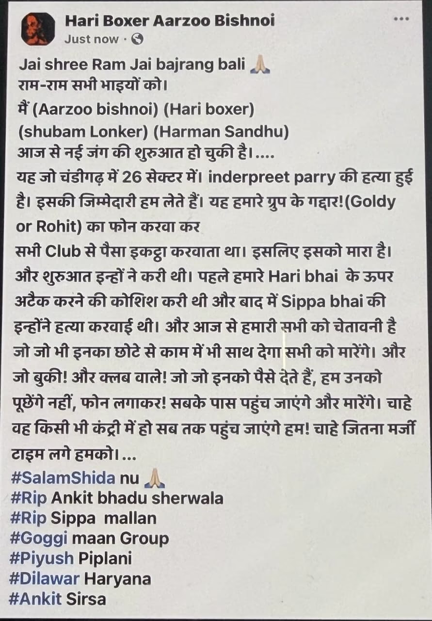 A post from the Bishnoi gang mentioned that Pari was deemed a traitor. 'Goldy or Rohit' used to make calls so Pari could extort money from clubs. That is why he was killed. It all began with him, he first attempted to attack our Hari brother and later arranged Sippa brother's murder.