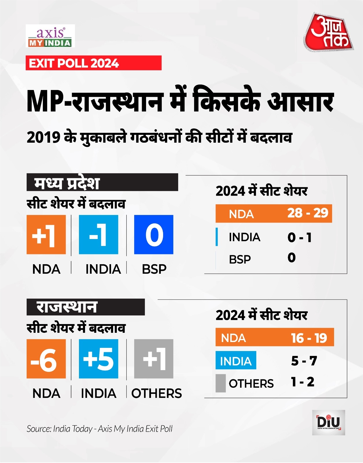The India Today axis my india exit poll highlights a probable landslide for the BJP in Madhya Pradesh with 28-29 seats. The Congress, on the other hand, may find itself with a meager 0-1 seats. The predicted vote share for BJP is a commanding 61%, in contrast to the Congress's likelihood of obtaining 33% of votes. In other developments, independents and others may hold 6% of the electoral pie. This marks a significant shift from the 2019 elections, where the BJP secured 58% of the votes, Congress 34%, and BSP close to 2% in Madhya Pradesh.