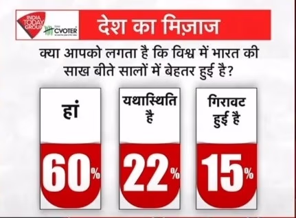 Addressing the inquiry regarding India's global reputation improvement, the survey shows 60% affirming a positive change, 22% perceiving no change, and 15% believing India's standing has declined.