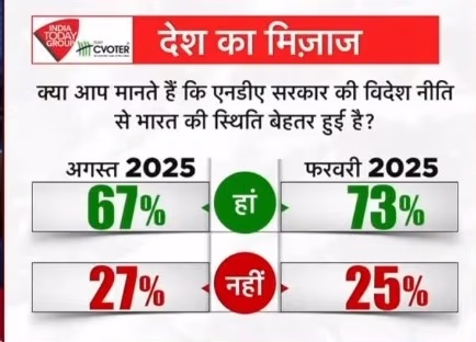 In the February 2025 survey, 73% had affirmed a positive outlook on India's global stance, facing a 6% decrease now. 25% had then disagreed, a figure that has now increased to 27%. Questions about India's global reputation were also presented in this survey.