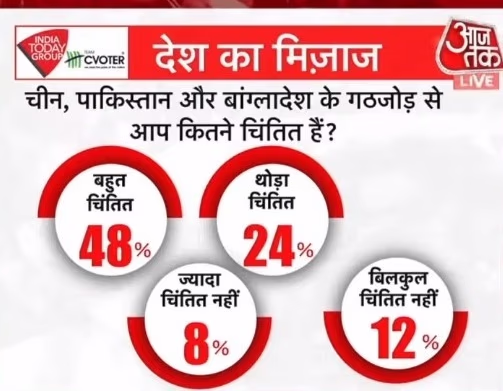 Responses showed that 48% were very concerned, 24% slightly worried, while 8% were not too troubled. Meanwhile, 12% expressed no concern at all. Additional questions focused on India's priorities regarding China.