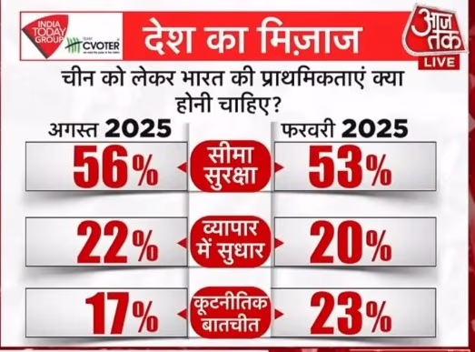 When asked about India's priorities concerning China, 56% emphasized border security, 22% focused on trade improvement, and 17% favored diplomatic dialogues. Back in the February 2025 survey, 53% prioritized border security, 20% trade improvements, and 23% diplomatic engagement.