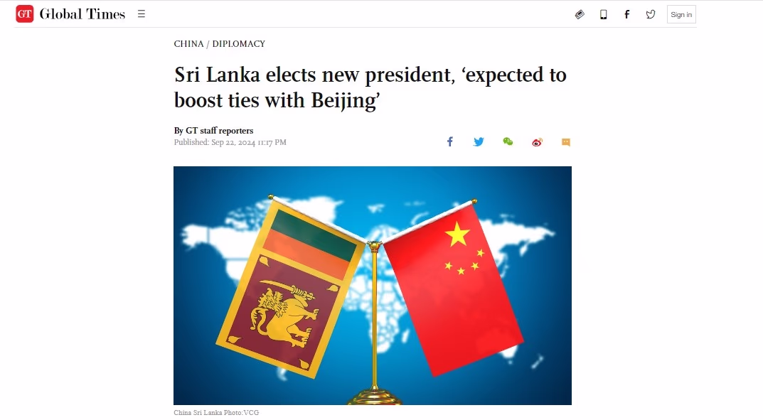 In Global Times' report, it was mentioned that Sri Lanka's new president would lessen the country's reliance on India and forge stronger ties with China.