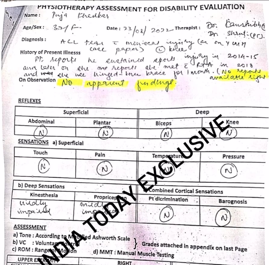 However, the physiotherapy department's report at YCMH stated that Pooja Khedkar had no disability. Despite this, the hospital administration issued a certificate indicating 7% locomotor disability in her left knee. Aaj Tak has exclusive documents illuminating contradictions between the physiotherapy department and hospital administration's decision-making.