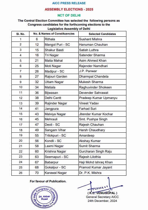 In preparation for the upcoming Delhi Assembly elections, Congress has released its second list of candidates. It includes 26 names. Late Tuesday evening, the Congress Central Election Committee (CEC) convened for a meeting where discussions centered around candidates for 35 seats. Ultimately, decisions were finalized for 26 seats, while the remaining 9 were held pending. This marks the second CEC meeting concerning the Delhi elections.